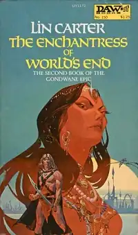 The Enchantress of World's End is a fantasy by American writer Lin Carter, set on a decadent far-future Earth in which all the world's land masses have supposedly drifted back together to form a last supercontinent called Gondwane. The book is chronologically the second in Carter's Gondwane Epic (the culminating novel Giant of World's End having been issued earlier). It was first published in paperback by DAW Books in May 1975, and reprinted in May 1977. A trade paperback edition was published by Wildside Press in January 2001 and an ebook edition by Thunderchild Publishing in January 2019. The book includes a map by the author of the portion of Gondwane in which its story is set and "A Glossary of Unfamiliar Names and Terms" by the author.[1]