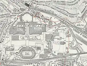 ![]() marked as Wembley Stadium station (centre-right), 1938 | |