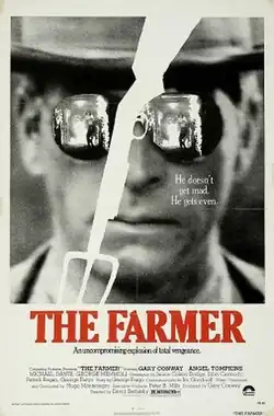 The Farmer is a 1977 American crime action film directed by David Berlatsky and starring Gary Conway, Angel Tompkins, Michael Dante, and George Memmoli. The film was released by Columbia Pictures on March 9, 1977. The revenge thriller is probably best remembered for its lack of a home media release, as the film never had a release on VHS, Beta, Laserdisc, DVD, or any other release outside of theaters for years until a limited edition Blu-ray was released by Scorpion Releasing in early 2022. The websites Letterboxd and The Grindhouse Database list this movie as belonging to the vetsploitation subgenre.[1][2]