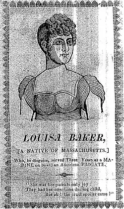 - Louisa Baker, Lucy Brewer, Mrs. West, George, Major B: Plymouth, Massachusetts born maiden who disguised herself as a man and wrote pamphlets on her adventures in New York and Boston dressed as a United States Marine.