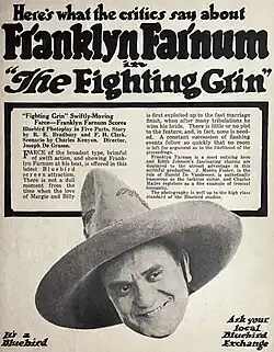 The Fighting Grin is a 1918 American silent comedy Western film directed by Joseph De Grasse and starring Franklyn Farnum, Edith Johnson and J. Morris Foster.[1]