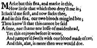 "The Flea" is an erotic metaphysical poem (first published posthumously in 1633) by John Donne (1572–1631). The exact date of its composition is unknown, but it is probable that Donne wrote this poem in the 1590s when he was a young law student at Lincoln's Inn, before he became a respected religious figure as Dean of St Paul's Cathedral.[1] The poem uses the conceit of a flea, which has sucked blood from the male speaker and his female lover, to serve as an extended metaphor for the relationship between them. The speaker tries to convince a lady to sleep with him, arguing that if their blood mingling in the flea is innocent, then sexual mingling would also be innocent. His argument hinges on the belief that bodily fluids mix during sexual intercourse.[2]