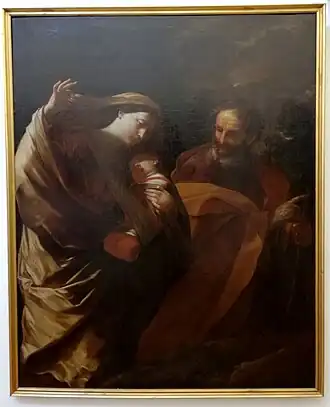 It was produced during Reni's second stay in Naples in 1621 to evaluate the possible commission to decorate the Royal Chapel of the Treasure of St. Januarius, which he later declined.[3] The events linking the work to the Gioralmini complex are unknown, but they may be the same as those of two other Reni works now in that collection, namely the commission by Giovan Domenico Lercaro, a wealthy tailor and textile merchant from Monopoli in Apulia but active in Naples.[1][2] That would make it and Reni's Jesus Meets John the Baptist and St. Francis in Ecstasy part of a donation of 57 works to the religious complex by Lercaro between 1622 and 1623.[1] Lercaro's will stated that the collection of works donated to the complex had to be exhibited in the choir and sacristy, with Christ Meets John the Baptist taking pride of place above the oratory's high altar, used by the fathers for private devotion, whilst Flight was in the church's choir.