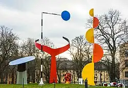 As a memory of the artist's extensive presence in the exhibition, Calder's The Four Elements was left standing outside the museum. The artwork became a signature and a veritable symbol of the Moderna Museet. It was donated to the museum by Alexander Calder and the engineer Allan Skarne in 1967. The Four Elements is a part of the Sculpture park (Swedish Skulpturparken) outside the Moderna Museet.