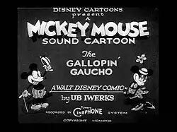 The Gallopin' Gaucho is a 1928 American animated short film and the second short film featuring Mickey Mouse to be produced, following Plane Crazy and preceding Steamboat Willie. The Disney studios completed the silent version in August 1928, but did not release it in order to work on Steamboat Willie.[1] The Gallopin' Gaucho was released, with sound, after Steamboat Willie on December 30 of the same year.[2]