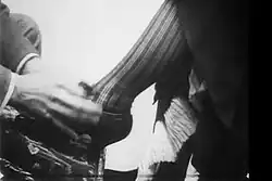 While the insert shot draws the audience's attention to the customer's shapely ankle, it does not represent what the shoe clerk sees. It's shot from the side, preserving the point of view of the theater audience.[3]