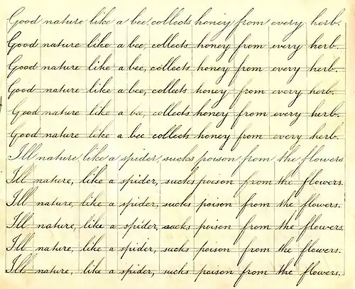 A page from a 19th-century copybook, in which the printed headings have been copied. The homily is paraphrased from the 17th-century sermon Against Detraction by Isaac Barrow: "Good nature, like a bee, collects honey from every herb. Ill nature, like a spider, sucks poison from the flowers."