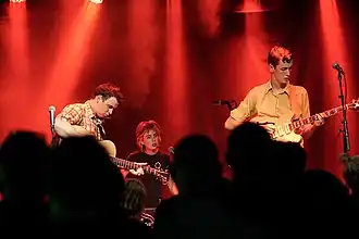 The Goon Sax was an Australian indie pop trio from Brisbane. Formed in 2013, the band consisted of Riley Jones (vocals, drums, lead guitar), Louis Forster (vocals, rhythm guitar, bass) and James Harrison (bass, rhythm guitar, backing vocals). The band were joined by touring musician Alistair Taylor (lead guitar, keyboards, drums) for live performances. Forster is the son of Robert Forster, co-founder of indie rock band the Go-Betweens. The band released their debut studio album, Up to Anything, in 2016 on the Chapter Music label.[1] This was followed by We're Not Talking in 2018, and Mirror II in 2021. They have performed with Twerps, Blank Realm, U.S. Girls, and Crayon Fields, among other artists.[2]
