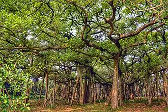 The Great Banyan is a banyan tree (Ficus benghalensis) located in Acharya Jagadish Chandra Bose Indian Botanic Garden, Shibpur, Howrah, near Kolkata, India.[1] The great banyan tree draws more visitors to the garden than its collection of exotic plants from five continents. Its main trunk became infected by fungi after it was struck by two cyclones. In 1925, the main trunk was removed to keep the remainder of the tree healthy. A 330-metre-long (1,080 ft) road was built around its circumference, but the tree continues to spread beyond it.