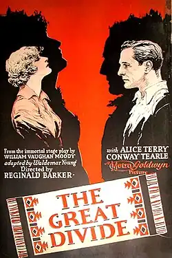 The Great Divide is a 1925 American silent drama film directed by Reginald Barker and produced and distributed by MGM. The film stars Alice Terry, Conway Tearle, and Wallace Beery. It is based on the William Vaughn Moody play, being the second of three film adaptations.[2] The play had been made famous on the 1906 Broadway stage with Margaret Anglin, Henry Miller, Laura Hope Crews, and a pre-Griffith Henry B. Walthall in the principal parts.[3]