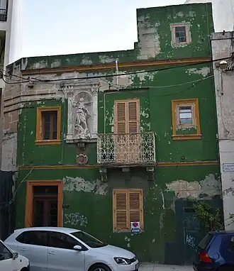 Predominantly on the façade sits a Baroque niche where a statue of the Assumption of Our Lady stands.[3] Being one of the first houses to be built in the area, the integral niche gave the name to the street that is found at, as St Mary Street. The later name was likely given as a consequence of the building being visible from different points of the street, which like the name of the house may origin from the residents's given reference.[4] The building is, however, addressed at No. 1, St Agatha Street, exactly at the cross-section of St Mary Street.[6] The niche received the blessing by Bishop Gaetano Pace Forno,[7] who awarded those who prayed in front of it with indulgences. A date is written on the niche as 1875, which is an approximate indication of when the building was built.[6]