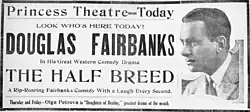 The Half-Breed is a 1916 film directed by Allan Dwan. It stars Douglas Fairbanks as Lo Dorman (a pun, as it phonetically means "Sleeping Water" in French)[1] a man competing for the love of the local preacher's daughter (Jewel Carmen) with the local sheriff (Sam De Grasse). The audience, however, are informed that Sheriff Dunn is actually Lo's father.