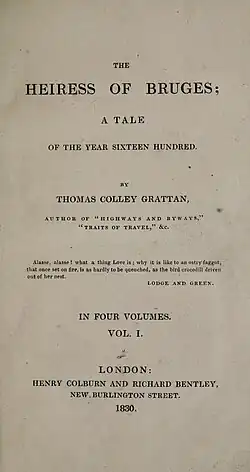 The Heiress of Bruges is an 1830 historical novel by the Irish writer Thomas Colley Grattan.[1] It was released in four volumes by London publishers Henry Colburn and Richard Bentley. Grattan wrote the novel while living in Brussels, shortly before the Belgian Revolution led to its independence from Dutch rule. He dedicated to Lady Bagot, the wife of British Ambassador Sir Charles Bagot. The work is set in Bruges around 1600. He was inspired partly by the success of the Waverley novels, and one reviewer described novel as the work of a "Flemish Walter Scott".[2] It was given a largely positive critical reception, sold fairly and well and was subsequently translated into several languages.[3] Grattan followed it with another historical novel set in the Low Countries Jacqueline of Holland (1831).