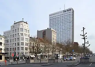 The hotel was built in the 1960s on the Boulevard de Waterloo/Waterloolaan in Brussels, a shopping area running from the Place Louise/Louizaplein to the Namur Gate. It was one of the first international hotels to be built in the city. At that time, the buildings along the Boulevard de Waterloo were all in neo-Rococo, neoclassical or neo-Renaissance styles.[8] The hotel building, however, caused a rupture with those styles being a massive tower containing 27 floors. The architect agency that designed the building was Montois Partners Architects, an agency located in Brussels.[9]