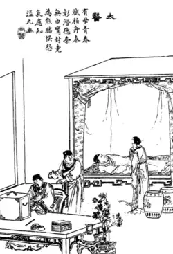 A review of "The Imperial Physician" in a 1992 collection of International Papers on Liaozhai (国际聊斋论文集) remarks that Pu Songling, in reviving Sun Pingshi from the dead, only to have him die again, is characteristically highlighting the inevitability of fate, whilst placing the protagonist in a limbo.[3] Further to the idea of inevitability is the fact that Sun unknowingly seals his own doom by consuming meat whose origins he is unaware of.[4] The author notes that Pu frequently references the theme of "underdetermination" (Chinese: 虚虚实实, romanizedFantasy and reality) as seen in other stories like "Wang Zian".[3] Another key theme in "The Imperial Physician" is filial piety; his sole motivation for becoming a jinshi is to make his mother proud, and so great is his love for his mother that he is unable to die in peace without having done her proud.[5]