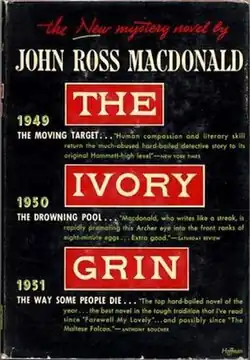 The Ivory Grin is Ross Macdonald's fourth Lew Archer detective novel, published in April 1952. Like most of Macdonald's, the plot is complicated and takes place mostly in out of the way Californian locations.