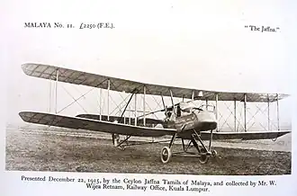 The Jaffna (MALAYA No. 11 (Fighter) The Jaffna) was a Royal Aircraft Factory F.E.2 aircraft of the Royal Flying Corps.[1] It was given to the British Government during World War I by Ceylonese Tamils who had emigrated from Jaffna to Malaya, on 22 December 1915.[2] The Jaffna was allocated to No. 25 Squadron.[3][4][5]