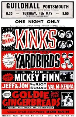 Including support acts, each performance lasted around two hours[16] and was compèred by Bob Bain.[13] The Kinks were accompanied on tour by their newly hired road manager, Sam Curtis.[12] The support acts on the program were Mickey Finn, Jeff & Jon, the Yardbirds, the Riot Squad, Val McKenna and the American band Goldie and the Gingerbreads.[13] One of the first all-female rock groups,[17][18] the Gingerbreads drew extra press attention during the tour and performed immediately before the Kinks.[18][nb 2] Single appearances were made by Unit Four Plus Two, who performed on 7 May, and the Rockin' Berries, who played in place of the Yardbirds on 5 May.[15][20]