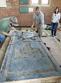 The tombstone was discovered in 1901 but was missing the brass fittings that should have been part of the tombstone. It is likely the inlays were destroyed during Bacon's Rebellion in 1676.[5] It was repaired at the time with portland cement which is now known to be a destructive method of repair.[6]
