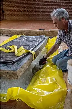 Once the pieces were assembled on the trailer, wooden shims were used to adjust the pieces to matching heights, epoxy was used to reattach the pieces with clamps holding the whole artifact together while the epoxy dried.[11]