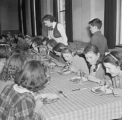 The school opened the day after the start of the Second World War in 1939 as the Baldock County Council School and within a week of opening had welcomed evacuee children from Stratford in London; in 1944 a photographer from the Ministry of Information took a series of pictures of students at the school to show the positive way that a typical country school was adjusting to life during wartime. These images showed students having medical examinations, taking part in sports and domestic science lessons, cooking over open fires and cultivating the school's playing field to grow food.[7]