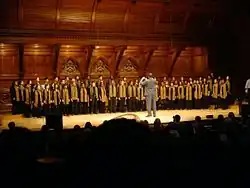 The Kuumba Singers hold a large concert at the end of each academic semester. The winter concert is dedicated to Dr. S. Allen Counter, the executive director of the Harvard Foundation and a strong supporter and advocate for Kuumba throughout Kuumba's history. This concert occurs on two nights in Harvard's Memorial Church and is free to the public. This concert celebrates to the true meaning of Christmas and the birth of Jesus, with infusions of music and performance from the African diaspora throughout the concert.[9] The spring concert, dedicated to Dean Archie C. Epps in remembrance of his spirited resistance to the organization, is held on one night towards the end of the spring semester. This concert takes place in Harvard University's Sanders Theater.