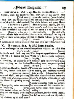 Betty Smales and R.Richardson wrote for the Ladies Diary Almanack, for the Year of Our Lord 1786 and married via the magazines pages. Charlotte Caroline Richardson was one of the results.