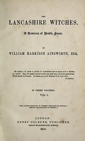 The Lancashire Witches is the only one of William Harrison Ainsworth's forty novels that has remained continuously in print since its first publication.[1] It was serialised in the Sunday Times newspaper in 1848; a book edition appeared the following year, published by Henry Colburn. The novel is based on the true story of the Pendle witches, who were executed in 1612 for causing harm by witchcraft. Modern critics such as David Punter consider the book to be Ainsworth's best work.[2] E. F. Bleiler rated the novel as "one of the major English novels about witchcraft".[3]