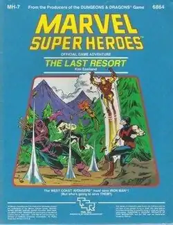 After acquiring the license to produce a role-playing game based on the Marvel Comics universe, TSR first published Marvel Super Heroes in 1984, and followed with many adventures. One of them was MH7 The Last Resort, written by Kim Eastland, with a cover by Ron Frenz, published by TSR in 1985 as a 16-page book, with a large color map, and an outer folder.[1]