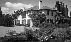 The Lodge is a 40-room Australian Georgian revival style mansion, located on 18,000 square metres (4.4 acres) of landscaped grounds. The origin of its name is unknown. It was built as a temporary measure, to be occupied by whoever was the prime minister "until such time as a monumental prime minister's residence is constructed, and thereafter to be used for other purposes". The original "prime minister's cottage" was built in 1926–1927 at a base cost of £25,000[2] and an eventual total of "£28,319 (approximately $2,298,825 AUD in 2020), including the landscaping of 2.8 hectares of grounds, construction of a tennis court and croquet lawn, and furnishing and interior decoration".[3] The architects were Percy A. Oakley and Stanley T. Parkes of Melbourne; the builder was J. G. Taylor of Sydney. Ruth Lane Poole of Melbourne was responsible for interior design and furnishing, as she had been for the governor-general's residence, Government House. The Lodge was intended as one of a set of three official residences, the others to be for the presiding officers of the Parliament of Australia (the speaker of the House of Representatives and the president of the Senate), but the others were never built.[4][5][6][7][8]