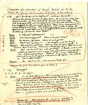 The rediscovered script shows Tiller's construction of the radio series. A sheet in Tolkien's handwriting shows that he rewrote a scene soon after the Nazgûl confrontation scene on Weathertop, in which the hobbit Frodo Baggins is stabbed by their leader, who had once been the Witch-king of Angmar, with a Morgul-knife.[8] Among the descriptions on the sheet for the narrator to voice, Tolkien redrafted the dialogue:[1]