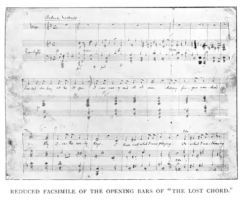 "The Lost Chord" is a song composed by Arthur Sullivan in 1877 at the bedside of his brother Fred during Fred's last illness in Fulham, West London, England. The manuscript is dated 13 January 1877; Fred Sullivan died five days later. The lyric was written as a poem by Adelaide Anne Procter called "A Lost Chord", published in 1860 in The English Woman's Journal.[1]
