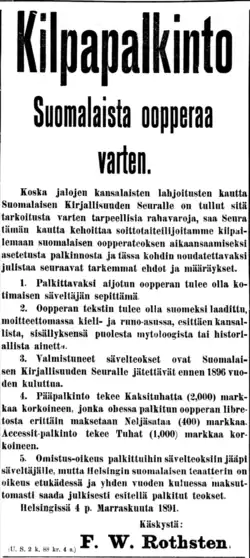 Acting as a catalyst, in 1891 the Finnish Literature Society organized a competition that provided domestic composers with the following brief: submit before the end of 1896 a Finnish-language opera about Finland's history or mythology; the winning composer and librettist receive 2000 and 400 markka, respectively.[88] Sibelius had seemed an obvious candidate to inaugurate a new vernacular era, as he had become a favorite of the Fennomans with his Finnish-language masterpiece Kullervo, a setting of The Kalevala for soloists, male choir, and orchestra.[89] The competition was the impulse for The Building of the Boat, the 1893–1894 project in which Sibelius had aspired to write a mythological, Finnish-language Gesamtkunstwerk on the subject of Väinämöinen. But Sibelius abandoned this opera due to self-doubt and artistic evolution.[8] In the end, the Society received no submissions,[90] and when Sibelius finally emerged with his first opera, it was 1896's The Maiden in the Tower to a Swedish libretto. In its reviews, the Finnish-language press asked for Sibelius's next opera to be in the vernacular.[26][25][91][g]