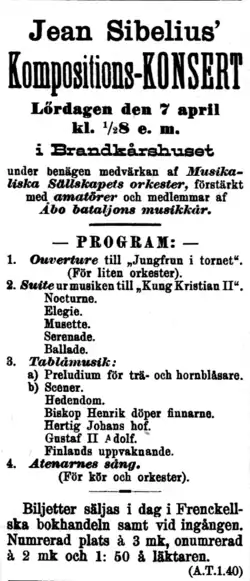 - ^ Also on the program was: Bonsoir, Monsieur Pantalon!, an 1851 opéra comique by the Belgian composer Albert Grisar (translated into Finnish); three special admission tableaux in the Sofia Room arranged by the Finnish artist Albert Edelfelt; and Salome's Dance ("Herodias dans" on the program), performed by Ingrid Silfverhjelm to Kaarlo Bergbom's "brilliant" choreography and Camille Saint-Saëns's Danse de la Gipsy from act 2 of the 1883 opera Henry VIII (Kajanus conducting).[23] This "spectacular" tableau stole the show and was twice encored.[22][20][23]