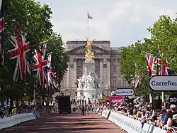 The annual London Marathon finishes on The Mall.[5] It was also the start and finish line for the marathon course, the road race and the race walks of the 2012 Olympic and Paralympic Games. The women's marathon took place on 5 August and the men's Olympic marathon on 12 August. The men's 20 km walk took place on 4 August, with the men's 50 km walk and women's 20 km walk took place on 11 August. The Paralympic marathons were held on 9 September.[6][7] In recent years the Mall has also been repeatedly used as the finishing line for UK cycling events, including the 2012 Olympics Road Races, the Ride London Prudential Classic in 2013, and stage 3 of the 2014 Tour de France. The opening ceremony for the 2019 Cricket World Cup was held on The Mall.[8]
