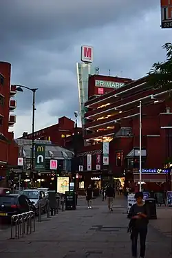 The centre was bought by current owners The Mall Fund in 2002 and renamed "The Mall Wood Green",[3] although the "Shopping City" signage remained as late as 2012. The new owners carried out a £30 million rebuilding programme, altering the layout of the shops and adding a 12-screen cinema.[9] The market hall was expanded, with a number of specialist retailers catering for the unusually diverse ethnic groups in the area.[10] In 2007 the owners applied for consent to expand the centre further with a 3-storey extension on the site of an adjacent petrol station,[11] which when complete will increase the mall size to 617,000 sq ft (57,300m2) and the total number of retail units to 123,[12] overtaking rival Brent Cross's 110 shops[13] for the first time. Approval was given in May 2007, despite concerns raised about the possibility of flooding on the new site from the River Moselle; in June 2007 it was announced that the bulk of the extension would be occupied by a new Debenhams store.[14] The proposal involved demolishing the existing Pearson's department store and extending the mall into space within and beyond this site. However, the Debenhams plan ultimately did not go ahead, and instead the bulk of the development site was taken up by a large Primark store.[15]