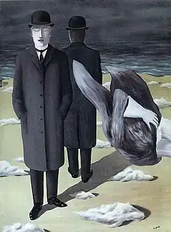 The canvas depicts two identically dressed men, wearing coats and bowler hats, standing with their backs to each other. They are in a seaside landscape dominated by a dark sky. While small clouds litter the ground, a shapeless gray mass where only a glove is recognizable appears to float in the air next to the two men; the one that faces the viewer has his eyes closed and his hands in his pockets.[2]
