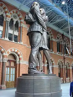 The Meeting Place is a 9-metre-high (30 ft), 20-tonne (20-long-ton) bronze sculpture that stands at the south end of the upper level of St Pancras railway station. Designed by the British artist Paul Day and unveiled in November 2007, it is intended to evoke the romance of travel through the depiction of a couple locked in an amorous embrace.[1]