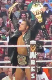 During this time, he gained a new entrance theme "I Came to Play", performed by the band Downstait. The Miz soon began a rivalry with MVP that began with a critically well-received verbal exchange between the two.[92] The two met in an unadvertised match for the United States Championship at the Royal Rumble on January 31, 2010, with the Miz retaining his title, but in the Royal Rumble match itself MVP eliminated both himself and the Miz.[93] Also around this time, the Miz formed a tag team with Big Show — later dubbed "ShoMiz" — and on the February 8 episode of Raw the two defeated D-Generation X (DX) (Shawn Michaels and Triple H) and The Straight Edge Society (CM Punk and Luke Gallows) to become the Unified Tag Team Champions, making the Miz the first wrestler in WWE history to hold three championships at the same time (United States, World Tag Team and WWE Tag Team Championships).[94] At Elimination Chamber on February 21, the Miz again successfully defended his United States Championship against MVP after interference from Big Show, ending their feud.[95] At WrestleMania XXVI on March 28, ShoMiz defeated John Morrison and R-Truth to retain the title again.[96] At Extreme Rules on April 25, ShoMiz took part in a tag team gauntlet match, and made it to the final two teams, but were eliminated by The Hart Dynasty (David Hart Smith and Tyson Kidd). The next night on Raw, ShoMiz lost the Unified Tag Team Championship to The Hart Dynasty, resulting in Big Show turning face by attacking the Miz after the match, bringing an end to the team.[97]