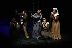 Gestus is one of Brecht's most significant theatrical techniques that combines the use of gestic expression and social meaning within a certain movement, vocal display or physical stance.[7] It is used to communicate the thematic and contextual ideas of the play or a specific scene within the play, and highlights a character's relationship with others by revealing their social attitudes.[31] According to theatrologist Meg Mumford, she attains that Brecht labels gestus as “presenting artistically the mutable socioeconomic and ideological construction of human behaviour and emotions” through “moulded and sometimes subconscious body language”.[7] This gestic action becomes transformed into a source of visual narrative that conveys "particular perspectives towards others and their circumstances".[5]