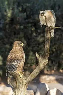 A slice from the trunk of a giant sequoia, featured on the Discovery Tree Walk.The Discovery Tree Walk: Fifty trees from habitats all around the world make this campus a botanical treasure. Each of these fifty trees is highlighted by an interactive sign that points out the tree’s botanical, geographical, historic, and folkloric features. One sign, for instance features a slice from the huge trunk of a 2000 year old giant sequoia tree from California. It stands beside Israel’s oldest living Sequoia tree.Sculptures of a Levantine sparrowhawk (top) and a steppe buzzard (bottom), two migratory birds that pass through Israel, featured on the Bird Migration Walk.