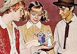 The live actors' scenes were filmed in front of a royal blue backdrop (an early forerunner to the modern-day CGI green screen) and the cartoon background and characters were animated in later.[10] Working with a technology still in its infancy, the young cast was required to master the art of engaging in conversational exchanges without having their animated co-stars to interact with. Shea recalled, "Injun Joe, for instance, was a cartoon character, so when I had to talk to him, I'd run my eyes slowly up the blue screen until the director told me to stop. Then I'd just try to remember where that point on the screen was."[10] Since the voice actors would not record their audio tracks until after principal filming was completed, character actor Bruce Watson, whom Shea described as "the greatest dialogue coach in the world", would perform the lines of all the animated characters during filming for the live-action stars to interact with.[15][10] Each episode reportedly took approximately 4 hours to film and six months to animate.[6][10]