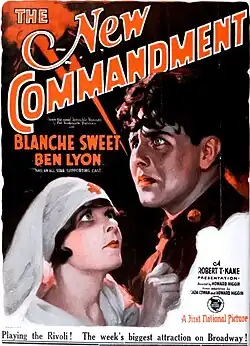 The New Commandment is a 1925 American silent drama film directed by Howard Higgin and written by Sada Cowan and Howard Higgin. It is based on the 1925 novel Invisible Wounds by Frederick Palmer. The film stars Blanche Sweet, Ben Lyon, Holbrook Blinn, Clare Eames, Effie Shannon, and Dorothy Cumming. The film was released on November 1, 1925, by First National Pictures.[1][2][3][4]