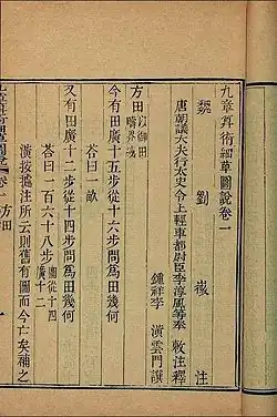 Areas of fields of various shapes, such as rectangles, triangles, trapezoids, and circles; manipulation of vulgar fractions. Liu Hui's commentary includes a method for calculation of π and the approximate value of 3.14159.[7]