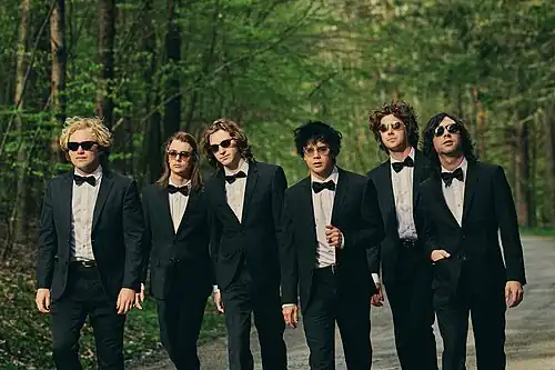 The Nude Party is a seven-piece American band originating from North Carolina, that consists of Austin Brose, Alec Castillo, Shaun Couture, Patton Magee, Don Merrill, Conor Mikita and Jon “Catfish” Delorme. Formed at Appalachian State University in 2012, the band have released three full-length albums, The Nude Party in 2018, Midnight Manor in 2020, and Rides On in 2023 in addition to Hot Tub EP in 2016.