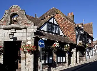 The Olde Bell inn, also known as Ye Olde Bell, is a Grade II listed historical inn in Rye, East Sussex.[1] It was built in 1390. It has a turbulent history and was once used for smuggling, connected by a secret tunnel with the nearby Mermaid Inn to the south. It was used by the infamous Hawkhurst Gang in the 1730s and 1740s who moved goods along the tunnel from the Mermaid to a revolving cupboard in the Old Bell for a quick getaway.[2] The inn has two separate bar areas with original oak beams and a terrace with an 80-year-old Wysteria tree.[3]