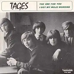 In June 1965, Tages' record label Platina released an eponymous EP with the group, which showcased the members' songwriting talent and a venture into a harder rock sound. At the same time, they embarked on their summer tour, which according to Göran Lagerberg came as a shock; "we had just learnt the basics of the show business and suddenly we were the most booked band of the summer".[9] Towards the end of July 1965, Tages had performed at roughly 140 venues in the span of just one and a half months, allowing for them to take a trip to London for a week, during which the band managed to gain new musical influences and clothes; it is also likely that rhythm guitarist Danne Larsson composed "The One for You" based on this trip.[4][10]