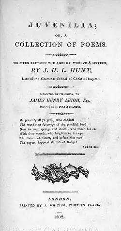 After Hunt entered into a series of competitions run by the Monthly Preceptor calling for the submission at the age of 15, his father Isaac Hunt collected his son's childhood poetry to publish them. Among these was The Palace of Pleasure, which was printed by James Whiting in 1801 in Hunt's Juvenilia after his family managed to collect over 800 subscriptions for the volume. The Palace of Pleasure was the final work in the volume, which was reprinted four times before 1805.[2] Attached to the beginning of the poem is a preface that shows Hunt discussing life in artistic and heroic terms, and he refers to himself when he describes "a Muse, who is entering into public in her sixteenth year, bashful on her first exhibition, and listening with trembling expectation, as she passes, to the shouts of disapprobation or applause that burst from the surrounding multitude."[3]