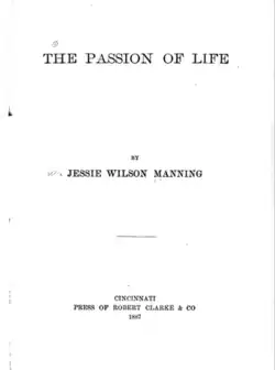 The Passion of Life was a 19th-century American book of poetry by Jessie Wilson Manning. Published in 1887 by Robert Clarke & Company, Cincinnati, Ohio, the 75 page printed volume, written in Chariton, Iowa,[1] was dedicated to Manning's mother, Mrs. Adeline Hensham Wilson. The work was a poem in five parts: I. "The Glamour of Youth"; II. "Song of the Soul"; III. "Lost Love"; IV. "May glides Onward into June "; V. "The Doubter ".[2]