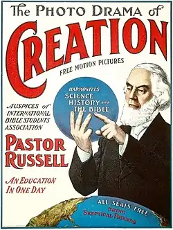 The Photo-Drama of Creation, or Creation-Drama, is a four-part audiovisual presentation (eight hours in total) produced by the Watch Tower Bible and Tract Society of Pennsylvania under the direction of Charles Taze Russell, the founder of the Bible Student movement. The presentation presents their beliefs about God's plan from the creation of the earth through to the end of the 1,000 year reign of Christ.[1]